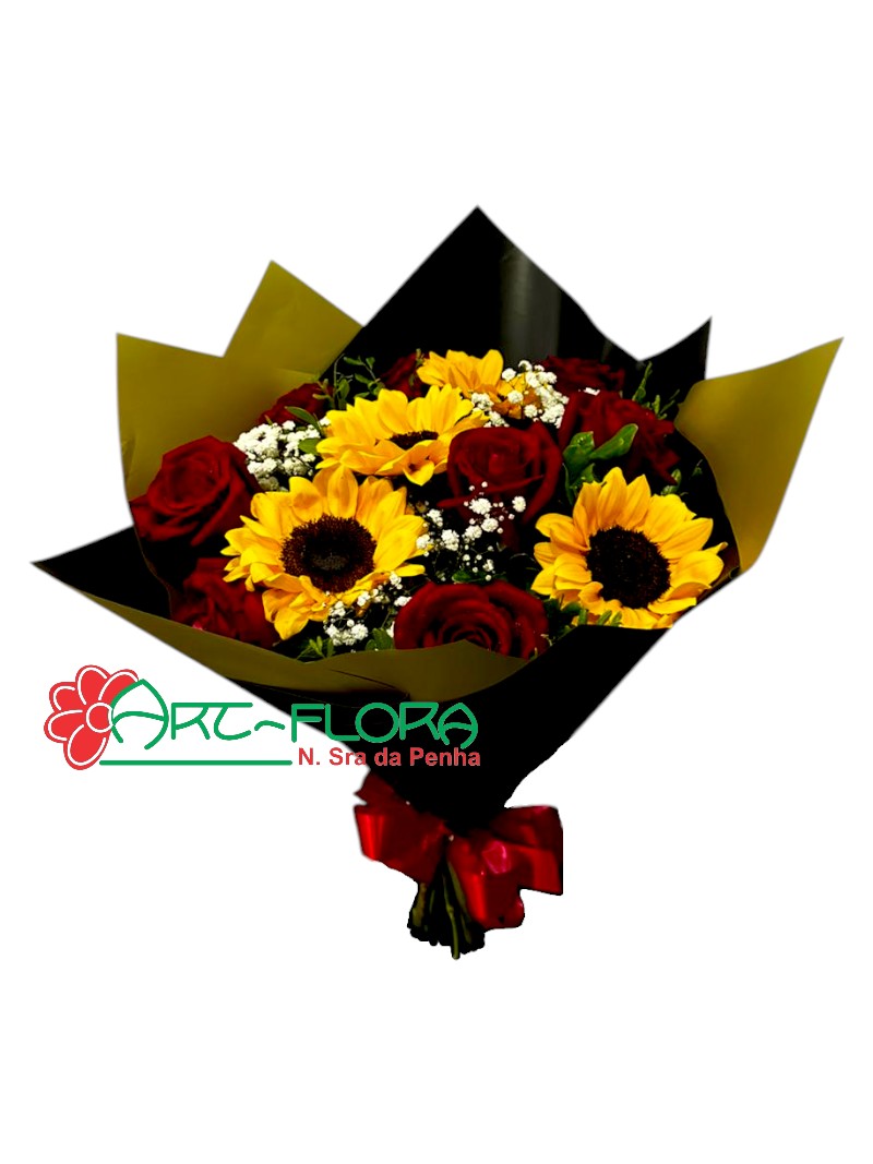 As rosas vermelhas nacionais, símbolo clássico de amor e paixão e girassóis vibrantes, que representam alegria, energia positiva e admiração. A delicada gypsophila (mosquitinhos) traz um toque de leveza e pureza, enquanto as folhagens verdes completam a composição com frescor e harmonia.