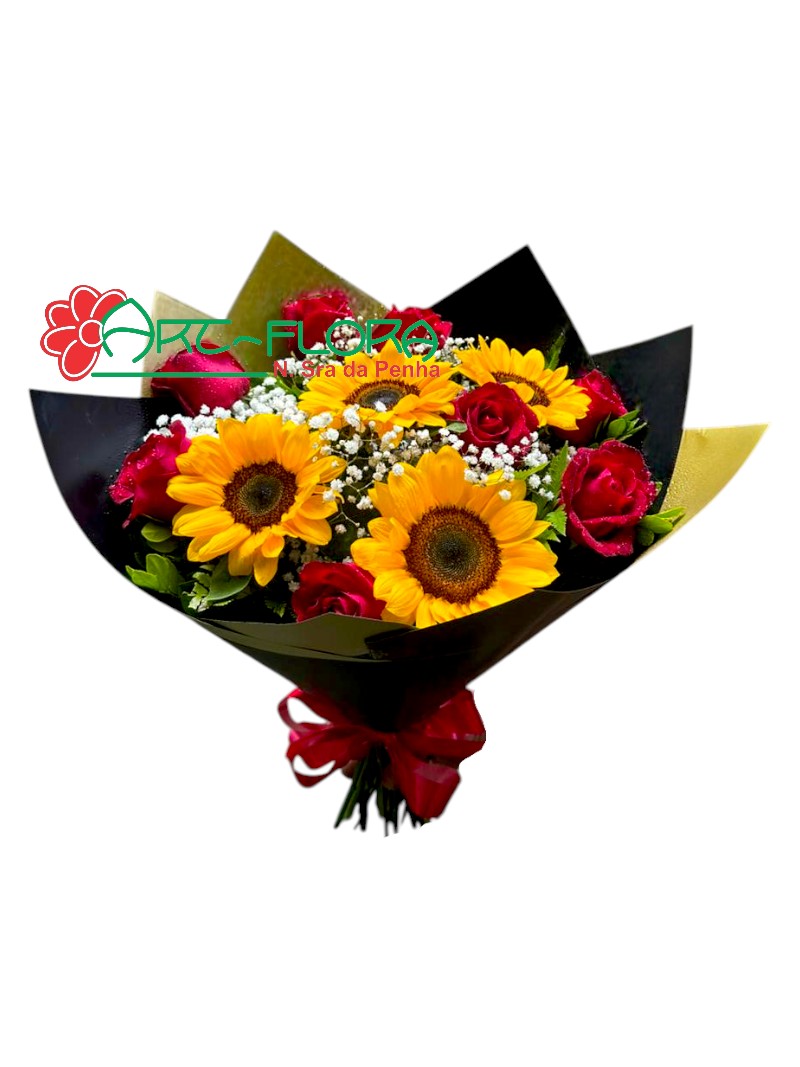 As rosas vermelhas nacionais, símbolo clássico de amor e paixão e girassóis vibrantes, que representam alegria, energia positiva e admiração. A delicada gypsophila (mosquitinhos) traz um toque de leveza e pureza, enquanto as folhagens verdes completam a composição com frescor e harmonia.